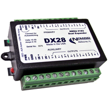 The DX28 Expander is a 2-channel signal splitter/amplifier for NMEA 0183 data signal distribution. It can be configured as one 1-in x 8-out expander, two 1-in x 4-out expanders, or an auto-switching expander. The two inputs are completely independent and can operate at the same or different baud rates up to 38,400. The selectable Auto-switching feature enables automatic switchover to the AUXILIARY input when signal is lost from the PRIMARY input. A bicolor (green/red) status LED on each input shows data activity and a third LED (yellow) provides overcurrent fault indication. Each input drives four independent RS-422 outputs. The inputs use differential detectors, which are isolated from Power and Ground. The outputs are independent so that shorting one output does not affect the others. The two channels (PRIMARY & AUXILIARY) are identical and completely independent of each other except in Autoswitch mode. For a single 8-way expander, the two inputs are strapped together. In "Autoswitch" mode a loss of PRIMARY data for 3 seconds automatically switches to the AUXILIARY input. When the PRIMARY signal returns, the DX28 immediately switches back to it.Frequently Asked Questions (FAQ) About Noland Engineering DX28 - NMEA 0183 Dual Expander